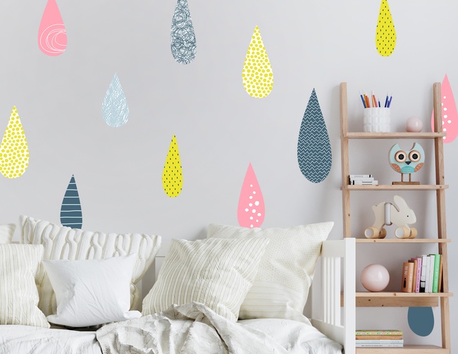 So ein Bastel-Projekt macht wirklich Spaß: Tropfen ausschneiden, auf der Wand verteilen und festpappen. Das Ergebnis – kunterbunte Wände – schöner kann ein Regentag nicht sein. Wandtattoo "Colorful Raindrops"! Und unter uns gesagt: Dieser Motiv-Aufkleber trifft mit seinen Farbtönen Gelb, Rosé und Blau samt Punkten, Kreisen, Tupfen, Streifen sowie Zickzacklinien, die perfekte Kombi aus Einfachheit und Coolness. Was will man mehr?
