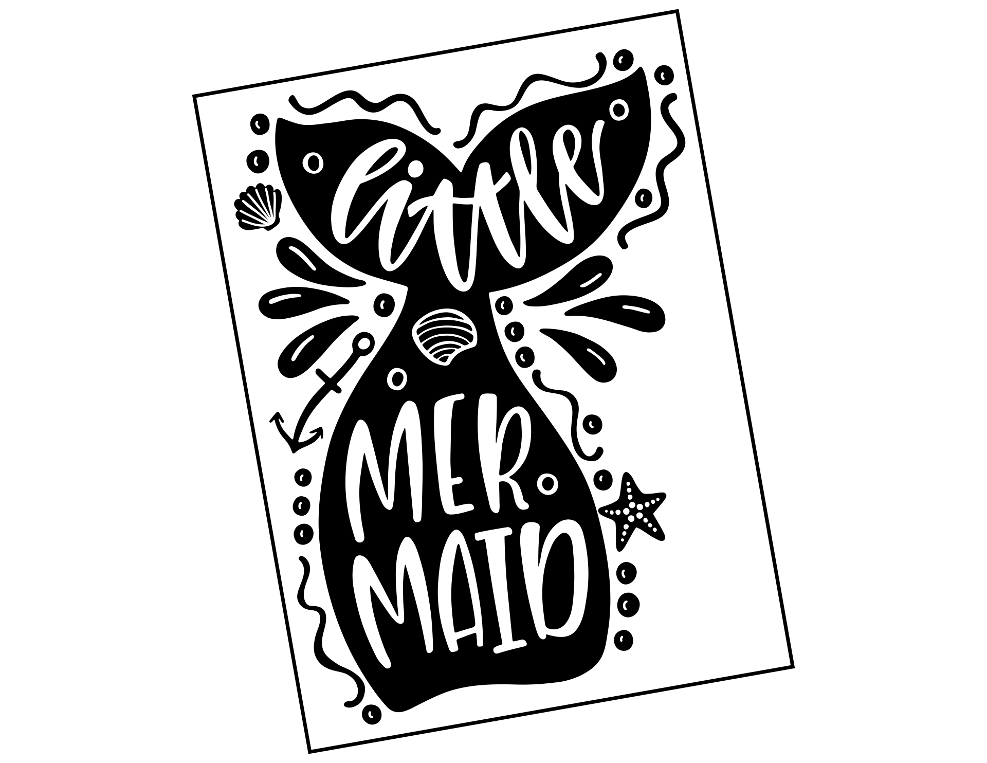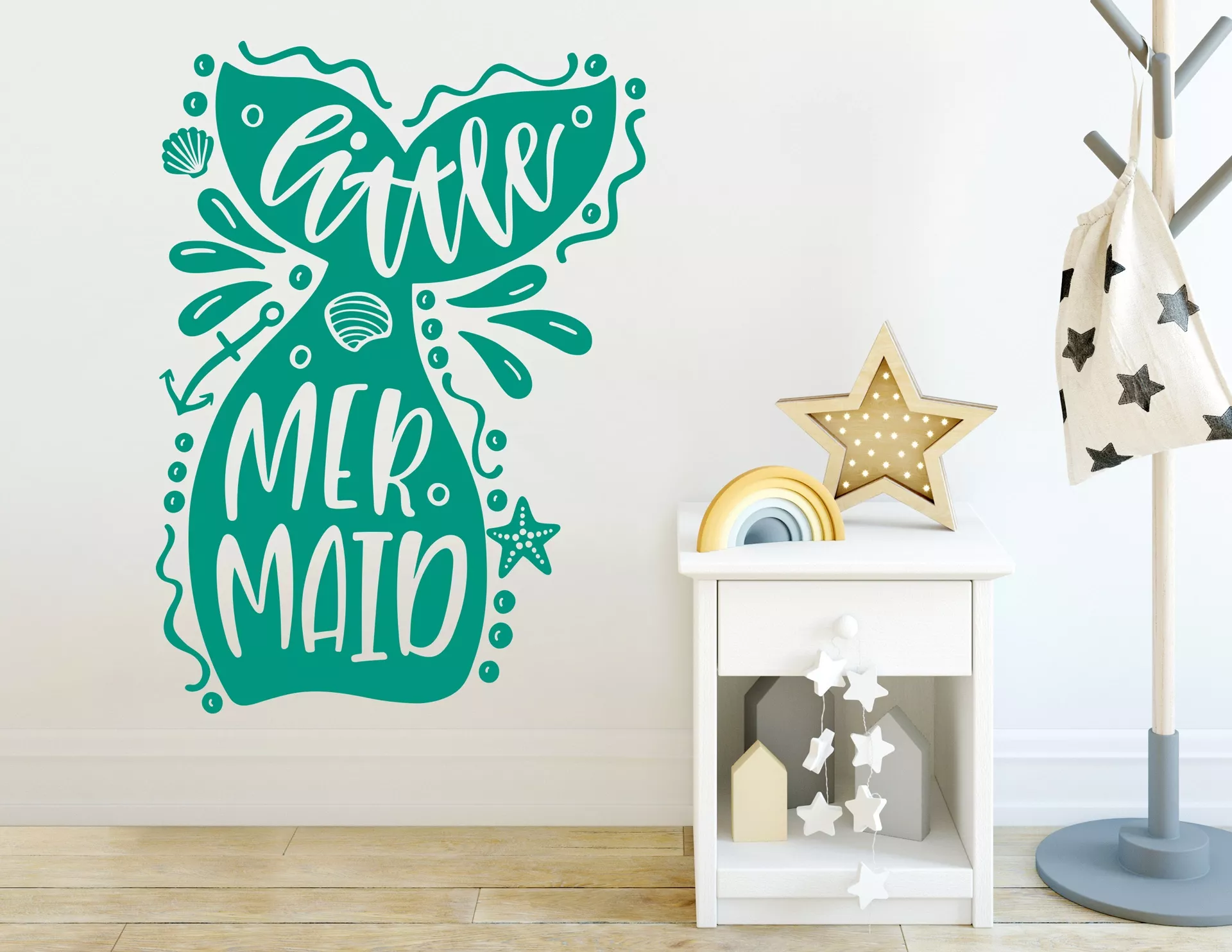 Wandtattoo Little Mermaid (dt. Kleine Meerjungfrau): eine märchenhaftes, handgezeichnetes Design in Form einer Meerjungfrauenflosse mit Motiven aus der Unterwasserwelt und einem Schriftzug im Handlettering-Stil, samt Anker, Kringeln, Luftblasen, Muscheln, Seestern und Wassertropfen.