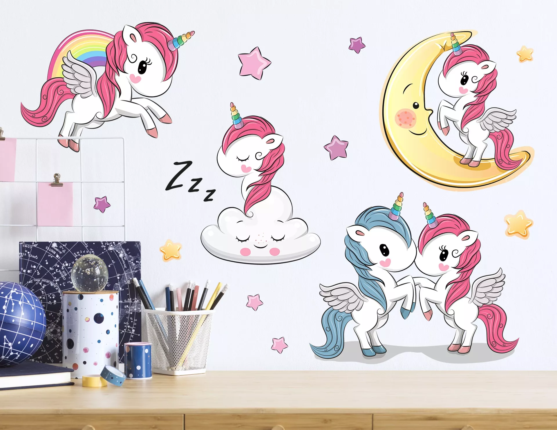 ... und dann von pinken Zuckerwatte-Wolken träumend eindösen. Einhörner haben es wirklich gut. Kein Wunder, dass wir Menschen sie gerne um uns herum haben und uns von ihnen an die schönen, simplen Dinge des Lebens erinnern lassen. Das Aufkleber-Set „Magical Unicorn Friends“ ist perfekt für diese Zwecke und überzeugt mit fünf niedlichen Einhörnern und vielen bunten Sternen zum freien Dekorieren.