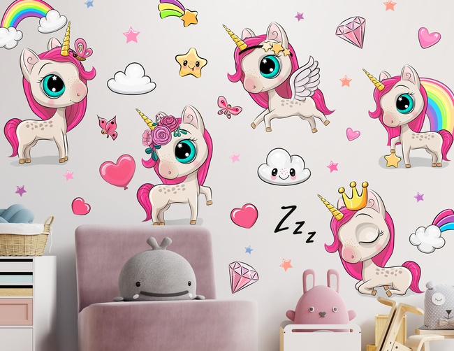 Wandtattoo "My Little Unicorn Ponys": Ein Aufkleber-Set mit fünf zauberhaften Fabelwesen samt vieler Herzen, Diamanten und Sterne zum freien Dekorieren.