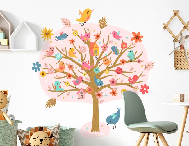 Wandtattoo „Vogelgesang im Rosenbaum“: Ein Zuhause für alle gefiederten Freunde, welches auch Dein Kinderzimmer als Wandtattoo fröhlich und farbenfroh dekoriert – samt Hügel, Blüten und vielen kunterbunten Piepmätzen.