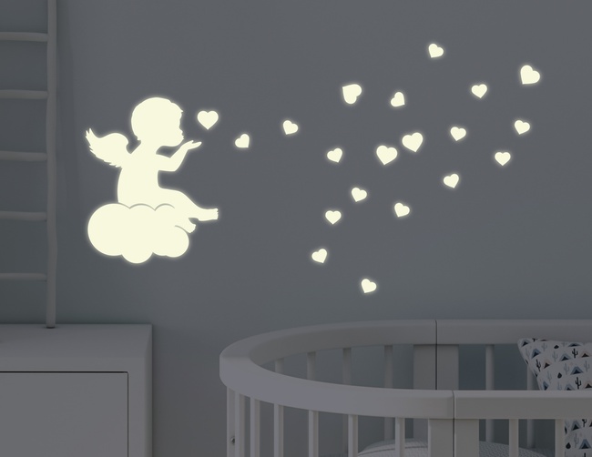 Das Set „Engel auf Wolke 7“ aus fluoreszierenden Leuchtfolie besteht aus: Einem Engel, 6 große Herzen und 20 kleine Herzen. Süße Grüße aus himmlischen Höhen verschickt dieser kleine, beflügelte Freund. Von seiner magischen Kusshand pustet er gleich einen ganzen Schwarm strahlender Herzen in die Luft, auf das sie die ganze Welt mit Liebe und Glück erfüllen.