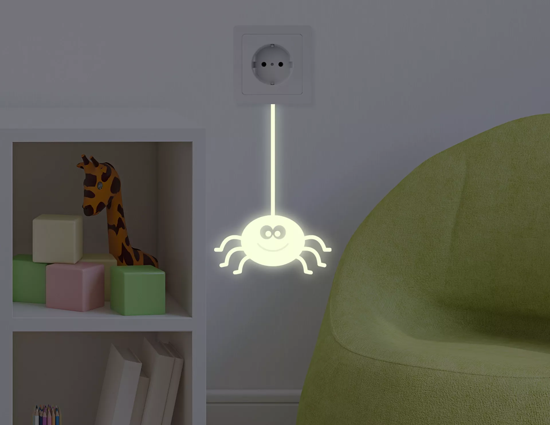 Das Leuchtsticker-Wandtattoo „Happy Spider“ leuchtet im Dunkeln und macht Groß und Klein jede Menge Freude an der Wand. Steckdosen erhalten so ein witziges Design.