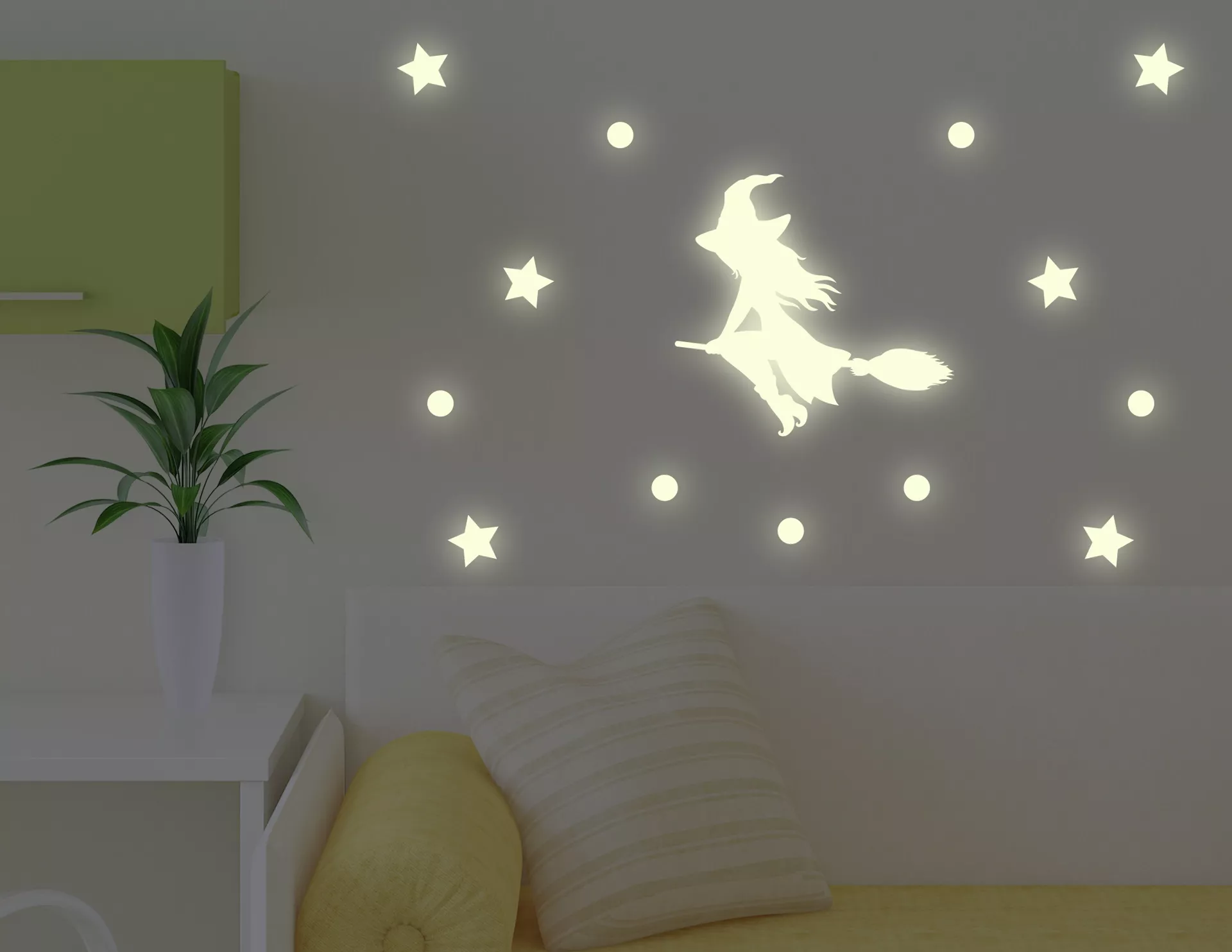 Das Leuchtsticker-Wandtattoo „Hexentanz“ freut allen großen und kleinen Hexenfreunde und gibt Deiner Wand ein magisches Flair. Unser Tipp: Damit die Folie bei Dunkelheit geheimnisvoll leuchtet, lass tagsüber genügend Licht ins Zimmer. Das Motiv kann sich dann bei Tag mit UV-Licht aufladen und gibt es abends nach und nach wieder ab.