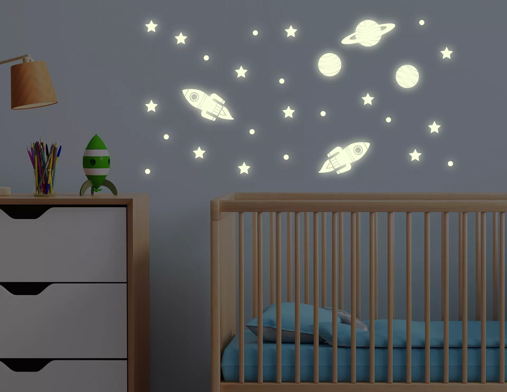 Kleine Astronauten aufgepasst: Das Leuchtsticker-Wandtattoo „Leuchtende Planeten“ verwandelt jedes Kinderzimmer blitzschnell in ein fantastisches Weltall!