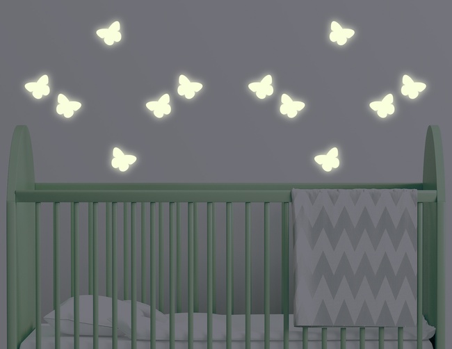 Das Leuchtsticker-Wandtattoo „Shiny Butterflies“ kommt mit 12 kleinen Schmetterlingen aus fluoreszierender Leuchtfolie. Süße Träume im Kinderzimmer sind garantiert!