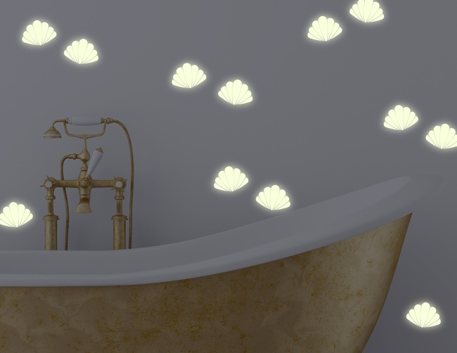 Muscheln in Sicht: Das Leuchtsticker-Wandtattoo „Shiny Shells“ zaubert 12 leuchtende Muscheln an die Wand. Für magische Momente im Bad an jedem Abend.