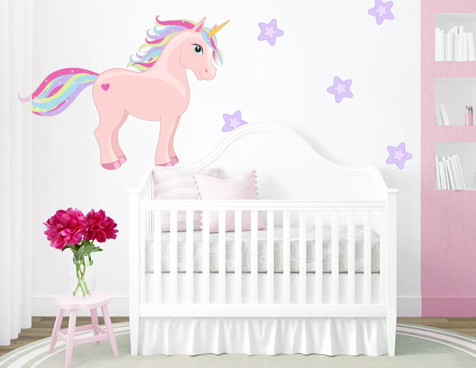 Unser Wandtattoo „Einhorn Scarlet Starshine“ kann mit Glitzer, Glamour und einer bunten Farbpracht punkten. Das schöne Fabelwesen wird von zahlreichen Sternen umrundet, die sein magisches Äußeres besonders betonen. Scarlet Starshine‘s Mähne und Schweif glänzen und glitzern in den schönsten Farben des Regenbogens und schaffen im Raum ein liebevolles und niedliches Ambiente.