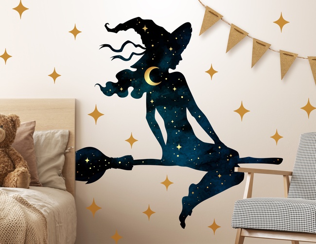 Hexen haben einen zweifelhaften Ruf. Zu Unrecht, wenn man sich die Geschichte genauer anschaut. Eigentlich waren Hexen gelehrte Kräutersammlerinnen und Heilerinnen. Mit diesem Wissen konnten sie viele Menschen retten und Gutes tun. Vielleicht hat sich auch unsere 'Night Witch' im Nachthimmelkleid mit ihrem Besen auf den Weg begeben, um jemandem mit einem Schutzzauber zu helfen?! Das Wandtattoo "Night Witch" samt Halbmond und vieler Sterne wirkt geheimnisvoll und ist vielleicht gerade deshalb die ideale Dekoration für märchenhafte Kinderzimmer, Jugendzimmer oder Schlafzimmer.