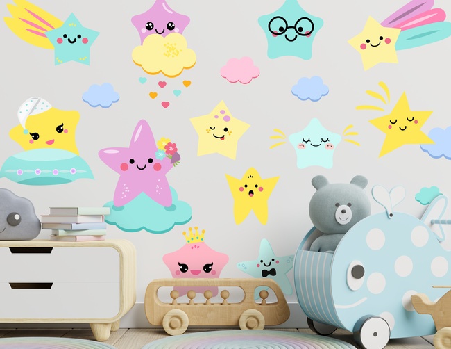 Es kann gar nicht bunt genug sein! Alle Farben passen zueinander und alles ist erlaubt – und das ist auch gut so – in der kindlichen Entwicklung. Quietschbunt und super süß kommen unsere "Stars for Kids" daher, die als DIY-Wandtattoo-Set das Kinderzimmer dekorieren dürfen. Dabei lassen sich die vielen Sterne mit jeweils unterschiedlichen Charakteren frei auf der Wand platzieren und erschaffen im Nu, ein wirklich fröhliches Umfeld. Übrigens auch für Türen, Fenster oder Möbel geeignet!