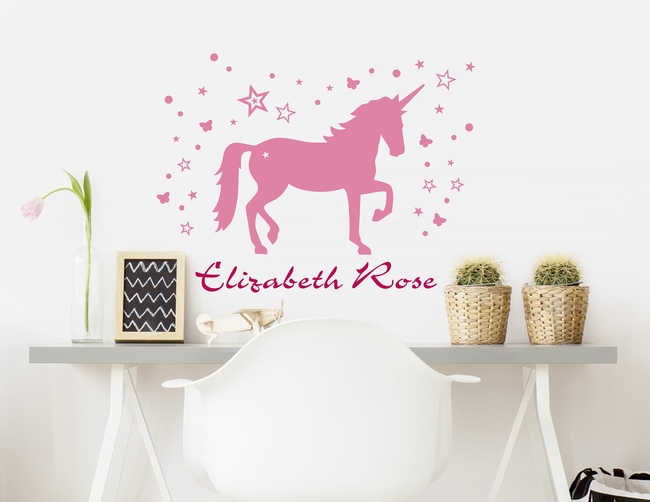 Einhörner erfreuen sich zunehmender Beliebtheit und das nicht ohne Grund. Dem Horn des Einhorns werden Heilkräfte nachgesagt. Zudem soll es unempfindlich gegen Feuer und Gift machen. Kein Wunder, dass Einhörner in so manchem Mädchenzimmer tagtäglich für ihren Schützling einstehen. Dieses märchenhafte Wandtattoo „ Einhorn Mythos“ verzaubert jedes Kinderzimmer in ein phantastisches Elfenland. Ein Traum für alle großen und kleinen Mädchen. Sterne, Pünktchen und Schmetterlinge geben der Wanddekoration den passenden Rahmen. Unterhalb des Motivs findet Dein Wunschname einen schönen Platz.