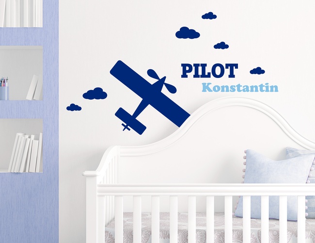Einmal um die Erde fliegen, fremde Länder bereisen und die Welt von oben sehen. Für viele Kinder ein Wunsch, der zum Träumen und Spielen einlädt. Wenn auch Dein Kind von einer Karriere über den Wolken träumt, triffst Du mit diesem süßen Wandtattoo für das Kinderzimmer ganz sicher den richtigen Geschmack. Dieses Wandtattoo stellt klar: Hier wohnt ein waschechter Pilot. Die perfekte Dekoration für jeden kleinen Flugzeug Kapitän. Klebefisch.de stellt die Maschine und die Wolken bereit. Jetzt nur noch den Namen Deines kleinen Piloten eingeben und schon heißt es: Ready for take off!