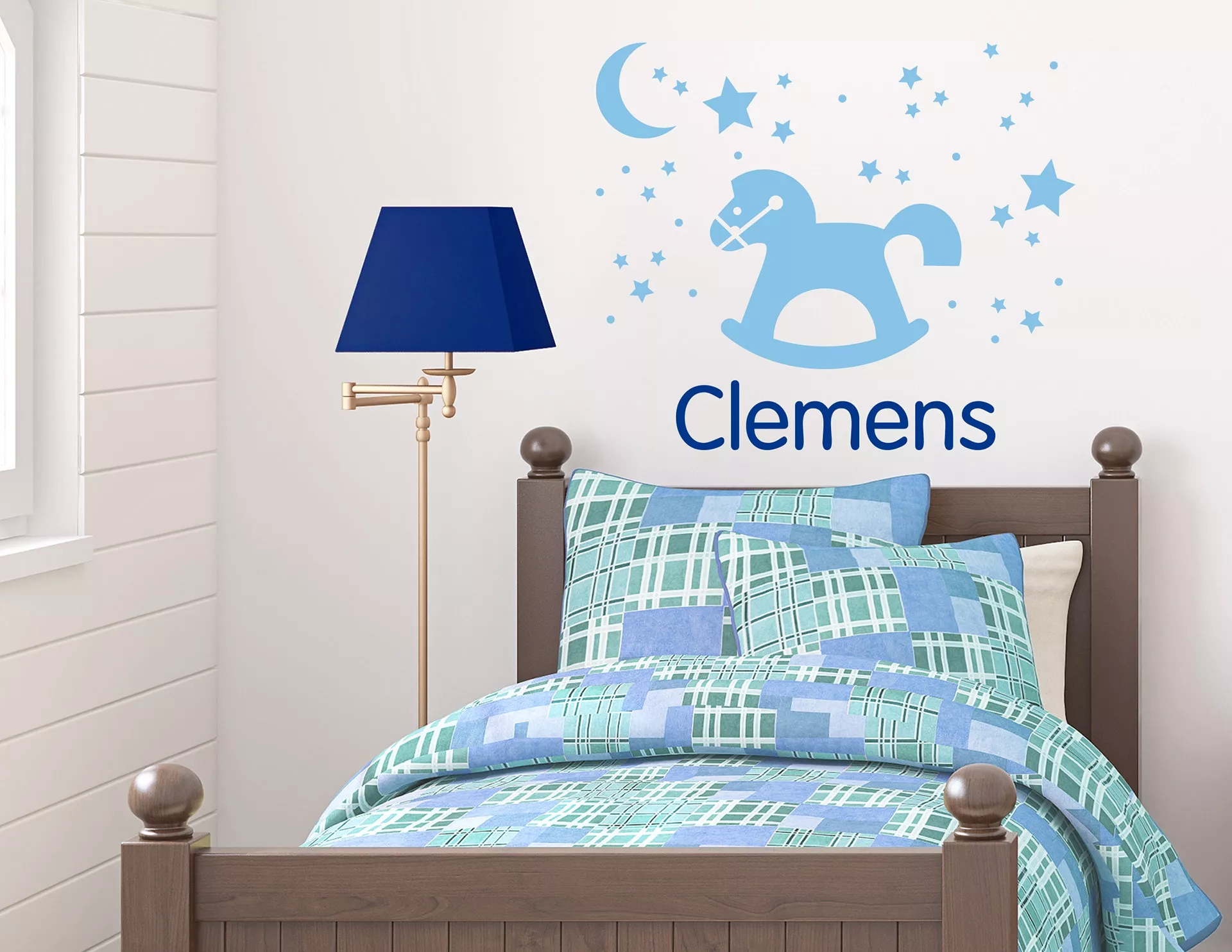 Für die kleinen und großen Fans des Schaukelpferds haben wir eine Dekoration für die Wand entworfen, welches Kinderaugen garantiert zum Strahlen bringt. Dieses süße Wandtattoo mit Schaukelpferd und Sternenhimmel verwandelt jedes Kinderzimmer im Handumdrehen in ein behagliches Schlummerland. Kombiniert mit Deinem Wunschnamen wird jede Wand zum Blickfang. Schaukelpferde im Kinderzimmer haben eine lange Tradition, die bis ins 17. Jahrhundert zurückreicht. Während es damals nur in reicheren Familien Einzug erhielt, kann man das beliebte Spielzeug heute fast überall vorfinden.