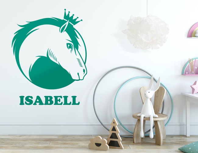 Das setzt dem ganzen die Krone auf: Das Wandtattoo "Pferdeprinzessin Ira" – für tierliebe Prinzessinnen und echte Pferde und Pony-Fans. Unser kreisrundes Design zeigt einen schönen Pferdekopf im Profil mit Krone und bietet, neben der detailreichen Gestaltung des Motivs, auch ausreichend Platz für einen Namen nach Wahl.