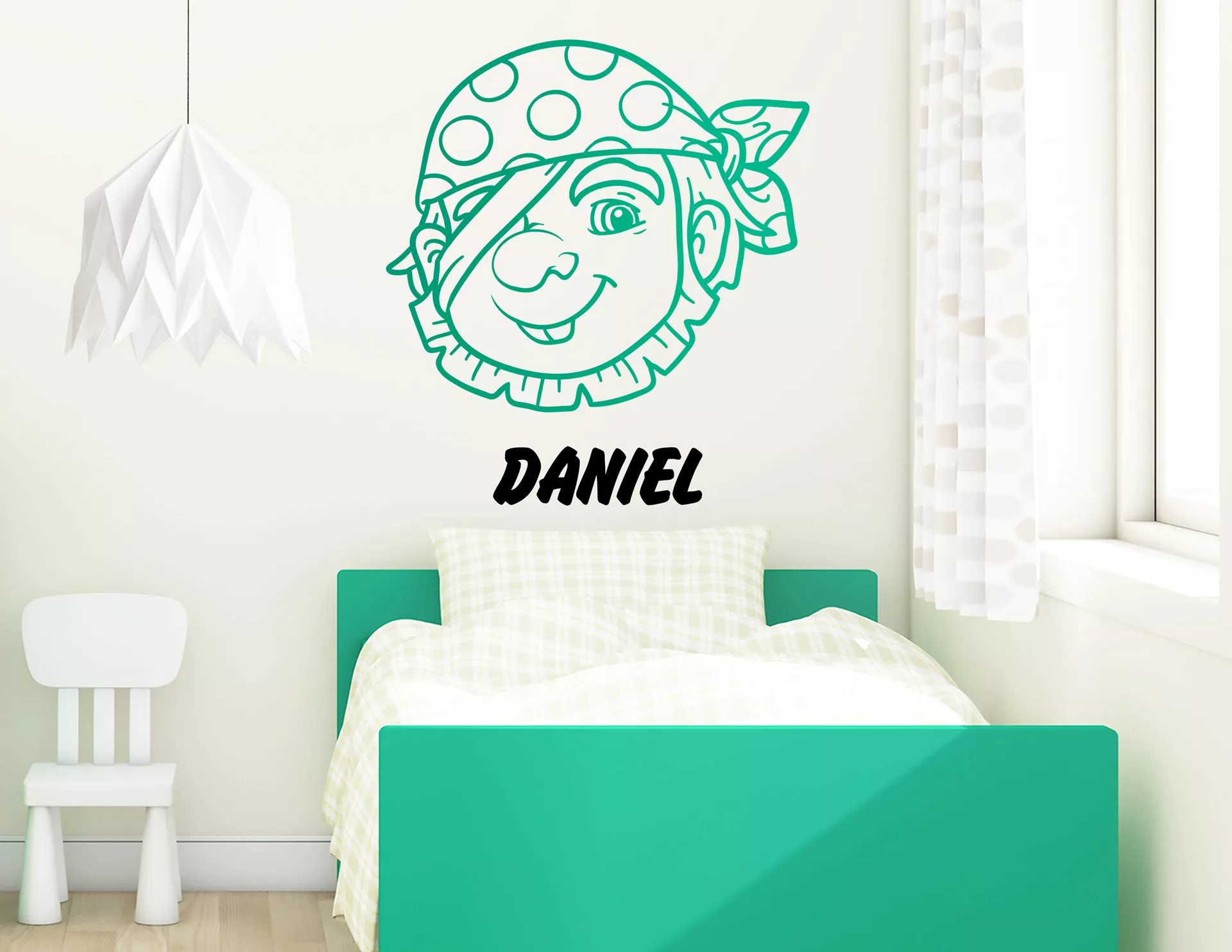 Unser Wandtattoo „Pirätchen“ verleiht Deinem Kind den waschechten Titel eines Piraten. Dabei wird großer Wert auf einen ungefährlich aussehenden Piraten gelegt, der Dein Kind in düsteren Nächten vor bösen Monstern und Albträumen beschützt. Erfülle Deinem Kind seine Träume und gewähre ihm einen echten Piratentitel! Der niedliche Kopf eines Piraten wirkt durch seine harmonische Umsetzung nahezu handgezeichnet und passt perfekt in jedes Schlafzimmer. Durch den variablen Namen lässt sich Deinem Kind ein echter Piratentitel verleihen. Das beeindruckt garantiert jeden Besucher!