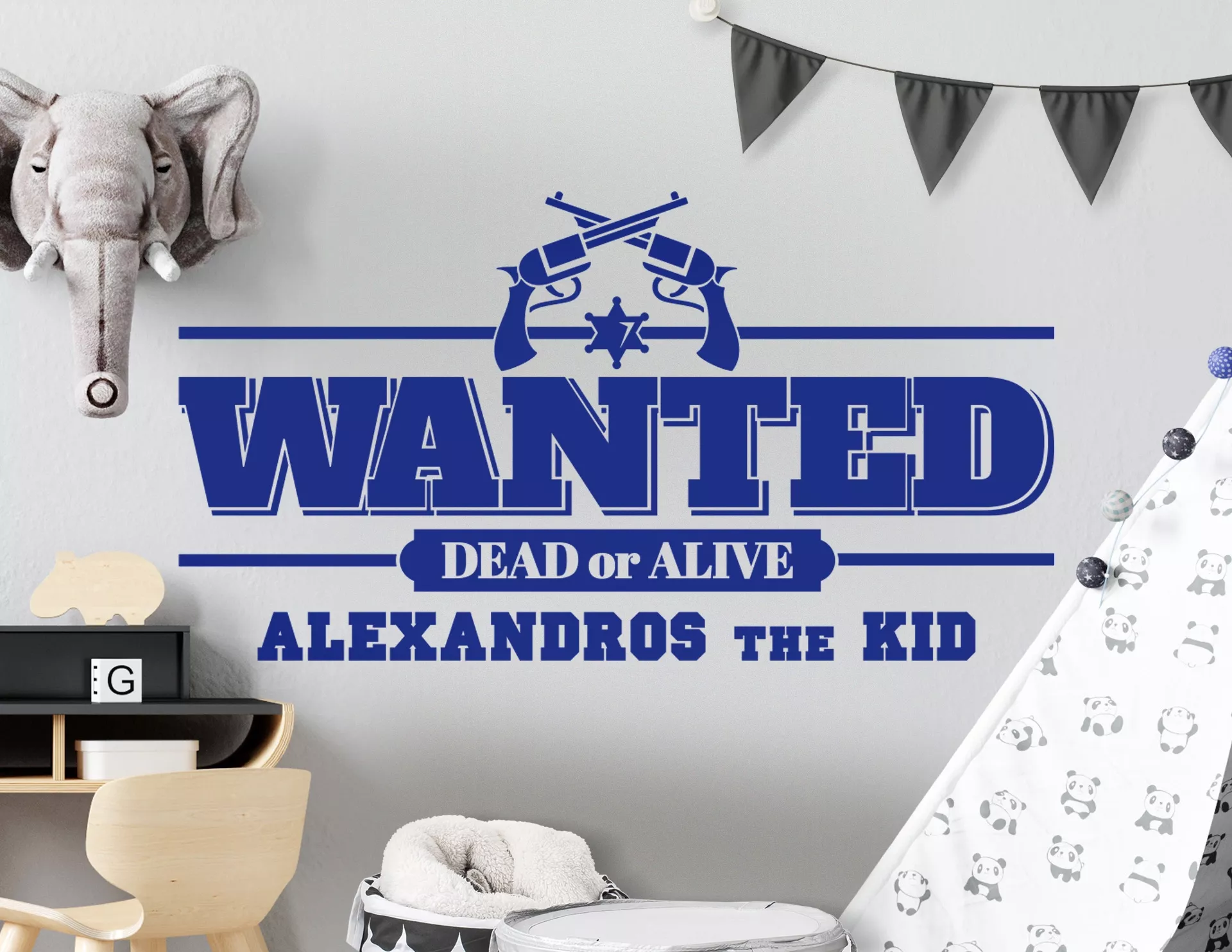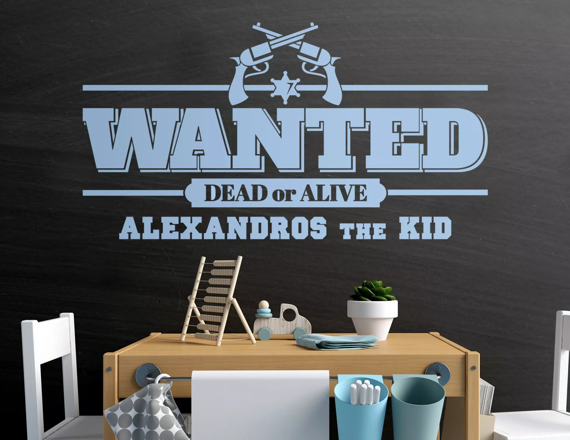 Der berüchtigtste und gefährlichste Bandit in diesem Kinderzimmer? Das bist Du! Kein Wunder, dass Du gesucht wirst, Cowboy... Das Wandtattoo "Wanted Dead or Alive" samt Pistolen und Stern ist da unmissverständlich.