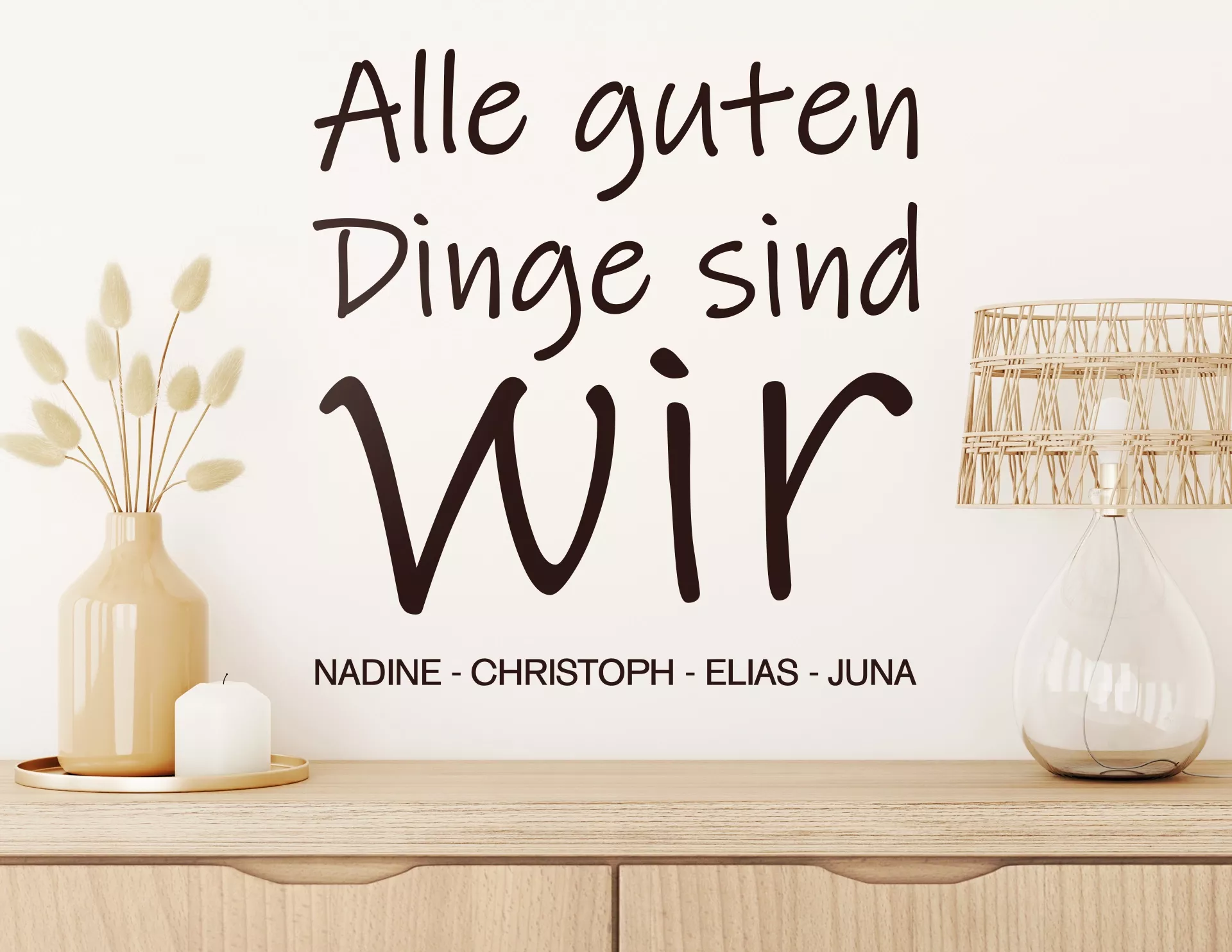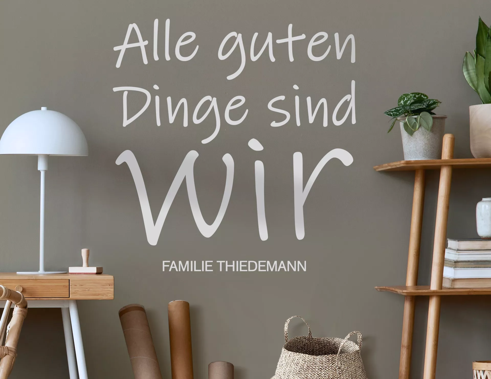 Alle guten Dinge sind wir! Eine Message die ein klares Statement setzt und mit der man auch gleichzeitig gut dekorieren kann. Ein Wandtattoo, fünf Wörter, drei Zeilen und Platz für die Namen der Liebsten… Also lasst uns die Familie feiern, denn sie ist es wert!