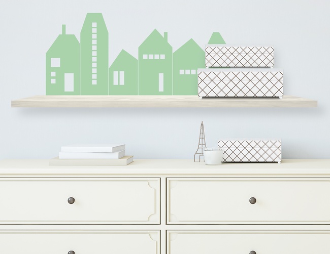 Das Wandtattoo „Haus an Haus“ zaubert eine kleine Stadt in Flur oder Wohnzimmer. Die Häuser setzen Regal und glatte Flächen gekonnt in Szene.