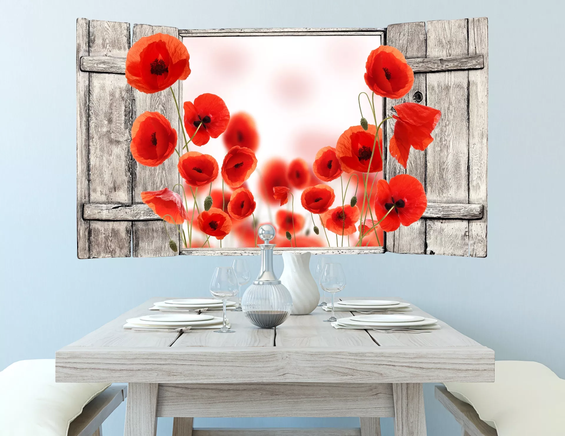 Genieße die prachtvolle Aussicht auf ein blühendes Mohnblumenfeld mit unserem "3D Wandtattoo Poppy Field", im hölzernen Fensterrahmen, samt zweier Fensterläden und bringe den Sommer zu Dir nach Hause.