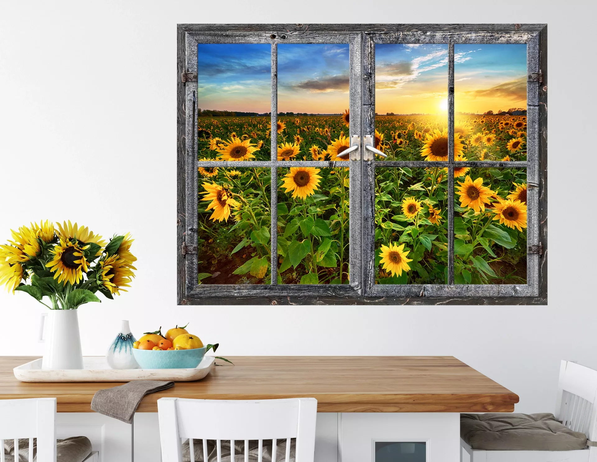 Verlängern wir doch einfach die warmen Monate des Jahres mit dem "3D Wandtattoo Sunflower Field", welches ganzjährig Ausblick durch ein hölzernes Fenster, auf ein blühendes Sonnenblumenfeld bietet. Perfekt für Räume, die etwas Sunshine-Feeling gut vertragen können!