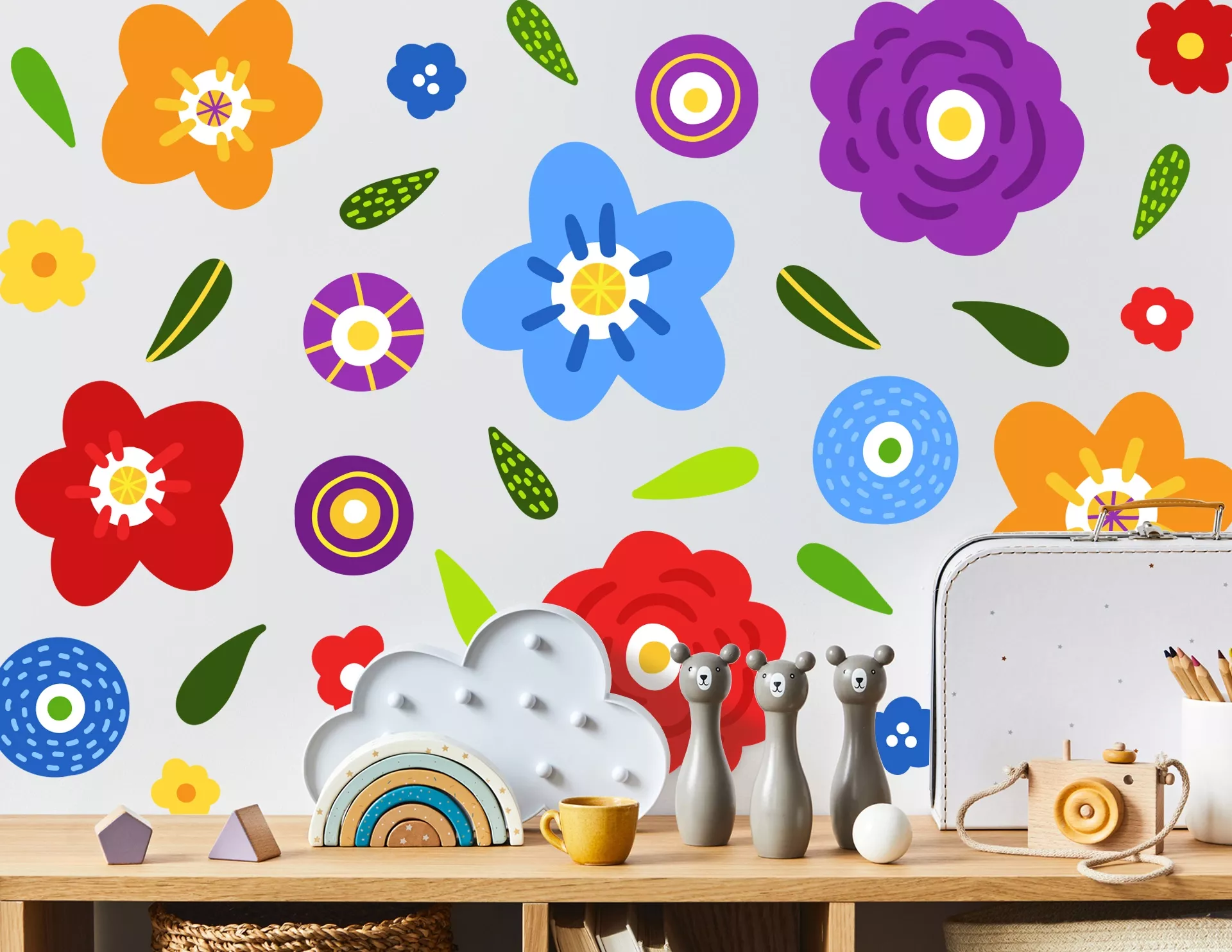 Ein Wandtattoo-Bogen voller bunter Blumen, total Retro und farbenfroh. Das ist unser DIY-Set Field of Flowers, das jeden Tag für gute Laune sorgt.