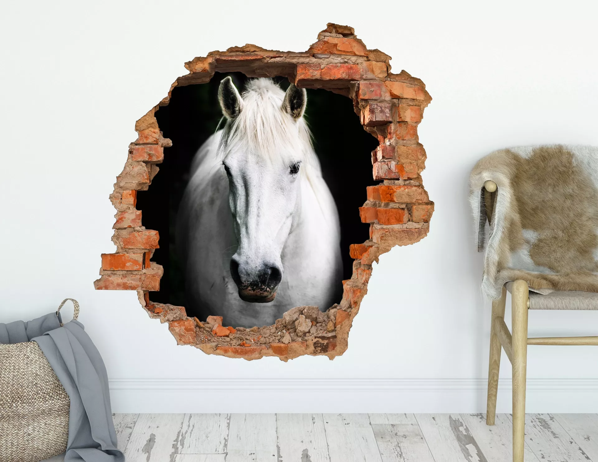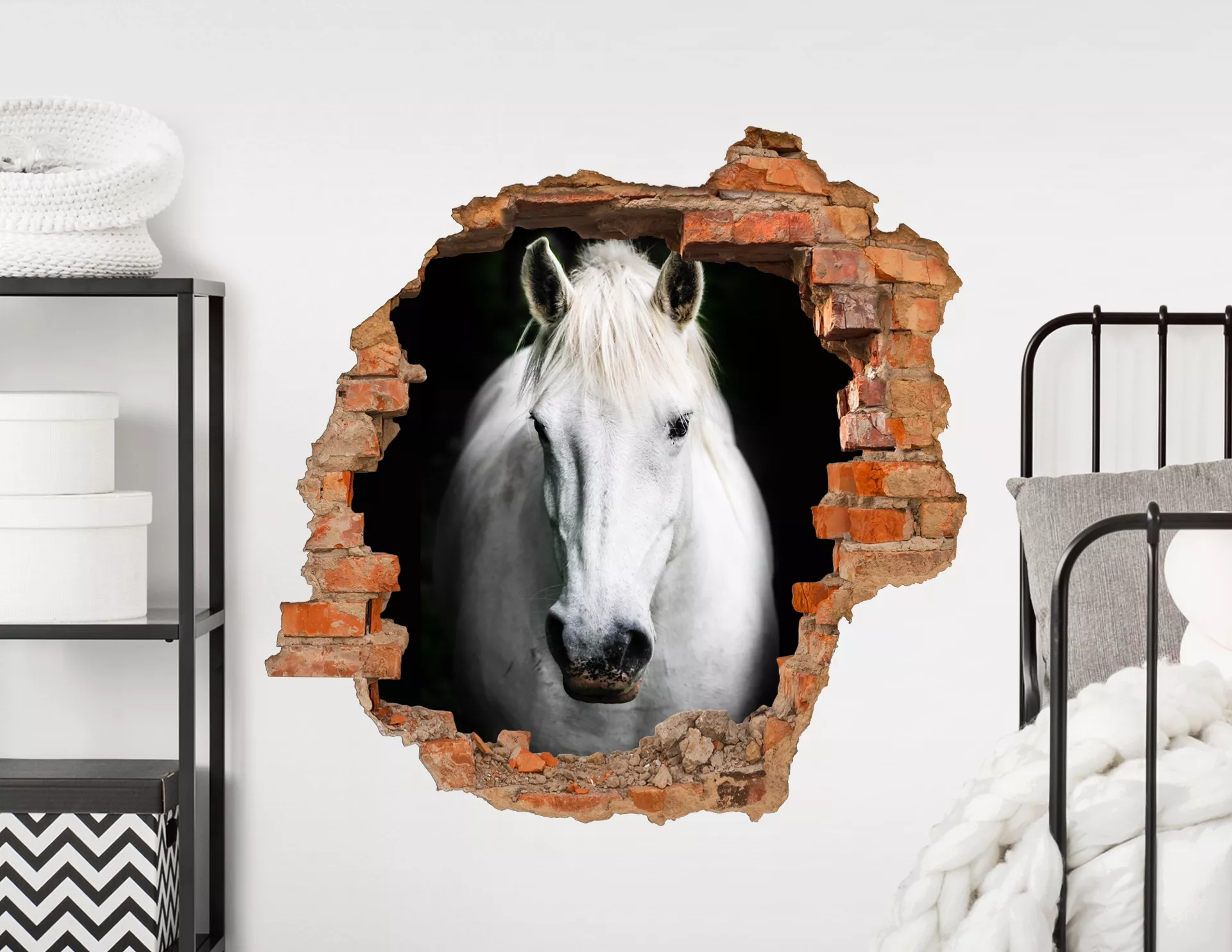 Lässt die Herzen von Pferde-Fans höher schlagen: Das Tier-Porträt "3D Wandtattoo Pferd Zoltan" mit einem prächtigen Schimmel im realistischen Mauerwerk-Rahmen.