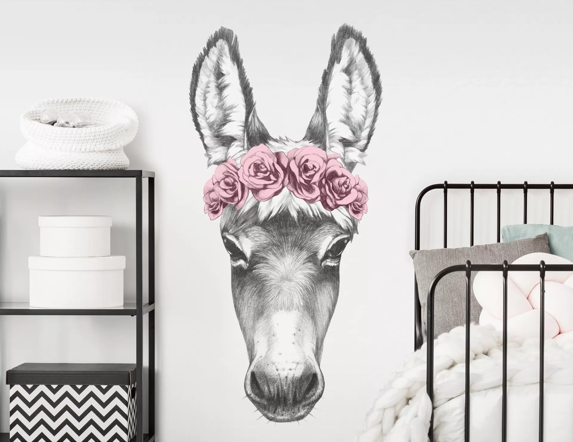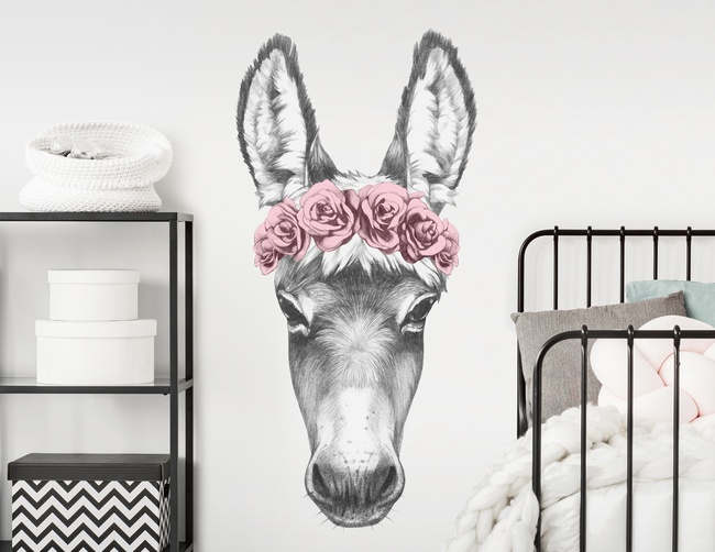 Esel gelten allgemein als sanftmütig, stark und klug – haben ihren eigenen Kopf und sind manchmal ein wenig stur. Was im Falle unserer Eseldame bedeutet, dass sie sich hin und wieder einen Kranz aus rosa Rosen ins flauschige Fell bindet – na und? Wenn auch Du ausgeflippt genug bist und es genauso machen möchtest wie unsere Crazy Donkey Lady, dann dekoriere Deine Wände mit diesem extravaganten Design zum Aufkleben.