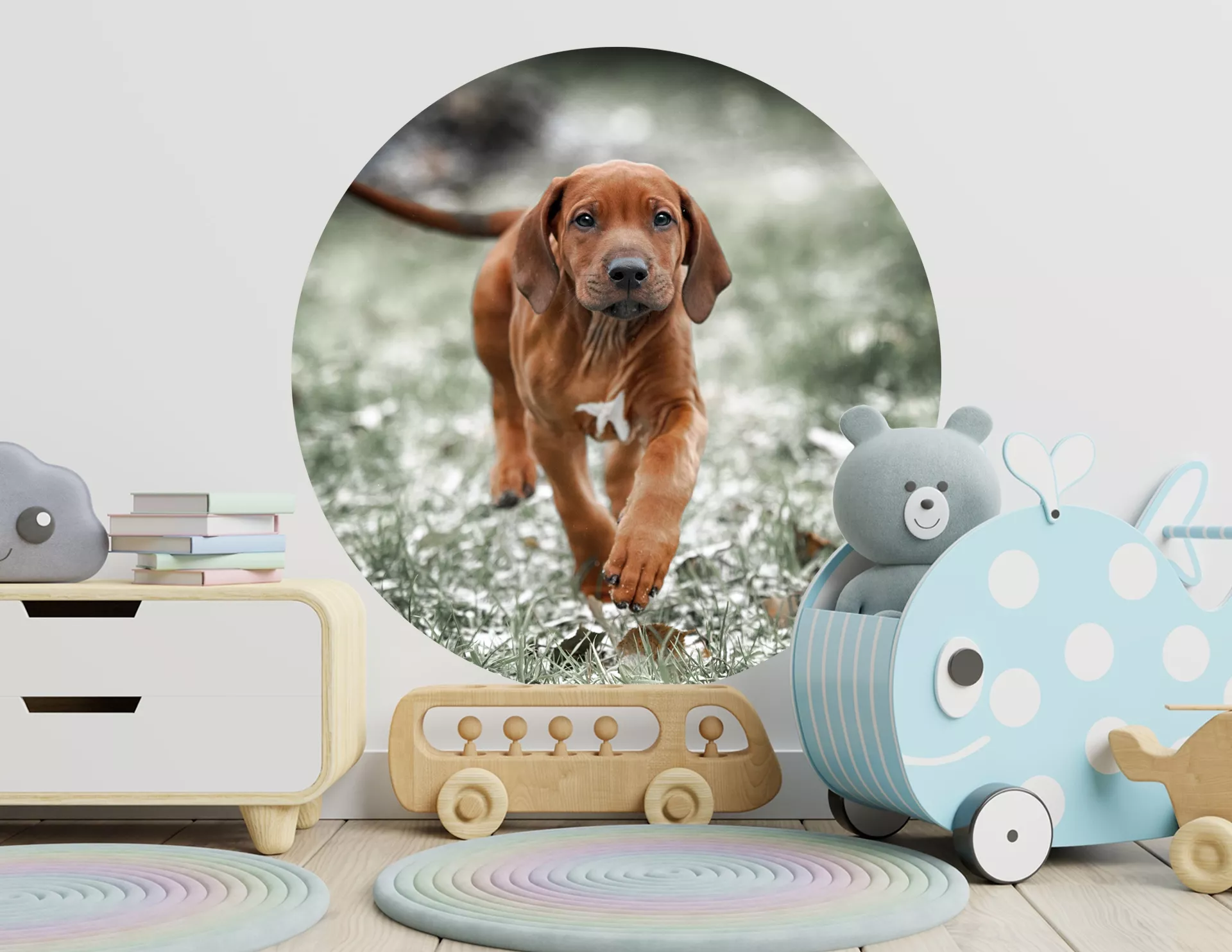 Wandtattoo "Hund Ari": Ein kreisrunder Tier-Aufkleber mit einem sportlichen Ridgie, welcher nie alleine gelassen werden möchte und jetzt schon einen Platz in unseren Herzen hat.