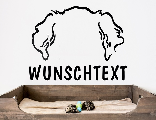 Der Lieblingsplatz ist dort, wo das Körbchen steht, nahe bei der Familie und im Warmen. Und für die passende Dekoration sorgt das Wandtattoo für Hunde mit Wunschnamen & Wunschtext. Die Umrisse zeigen zwei fellige Schlappohren, die vielleicht zu einem Golden Retriever, einem Doodle, Cookapoo, Cavalier King Charles Spaniel oder Hovawart gehören. Der illustrierte Umriss der hängenden Hundeohren wirkt liebevoll und macht deutlich, welche treue Fellnase hier zuhause ist.