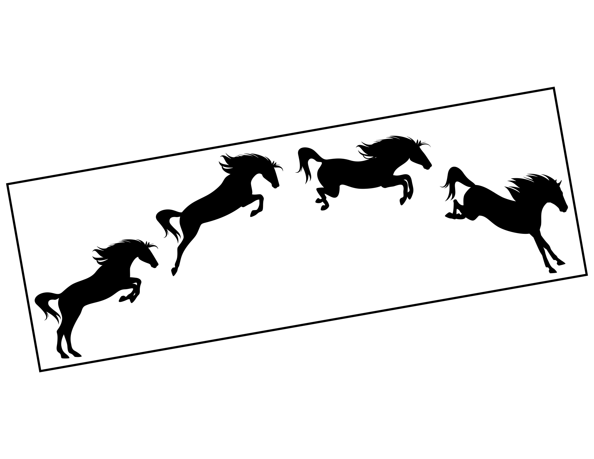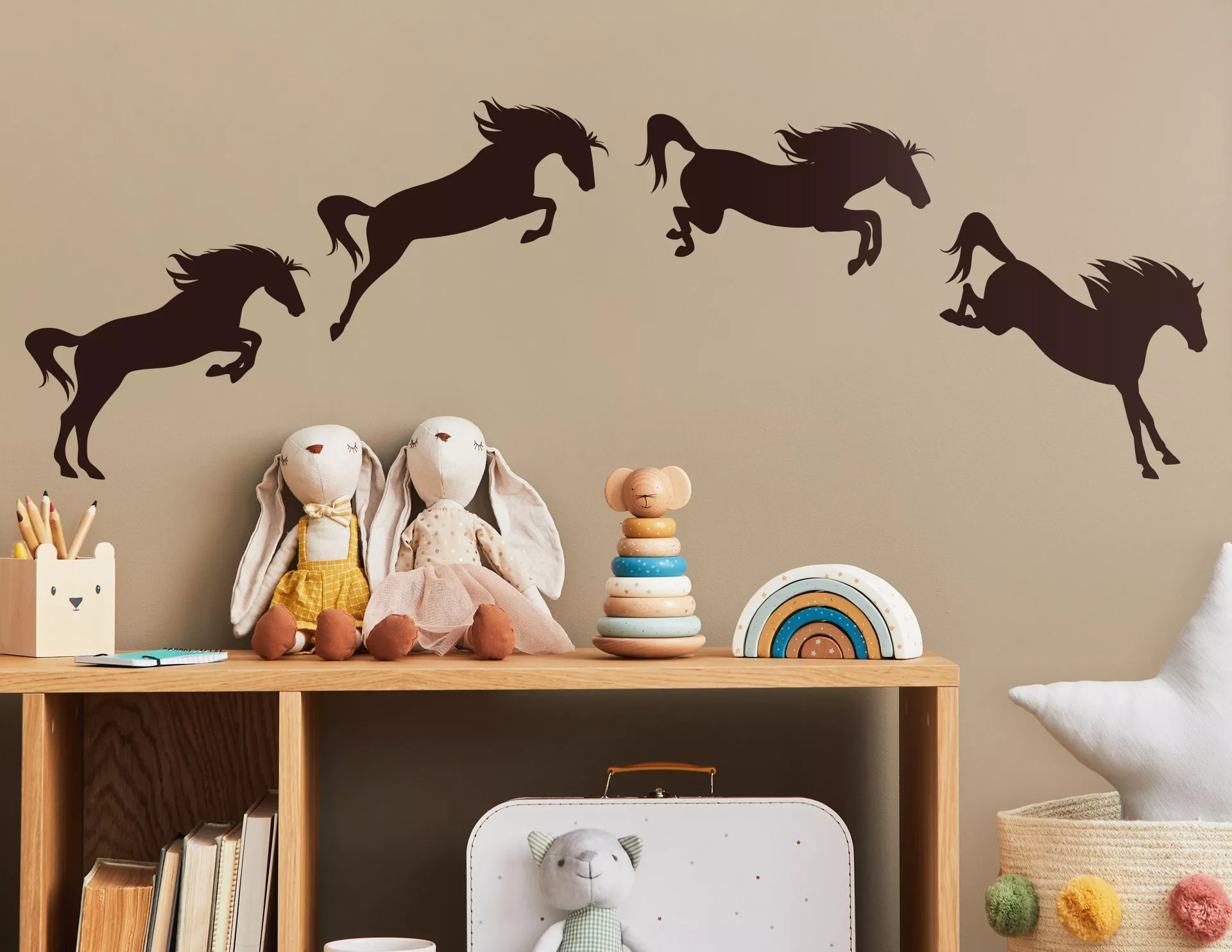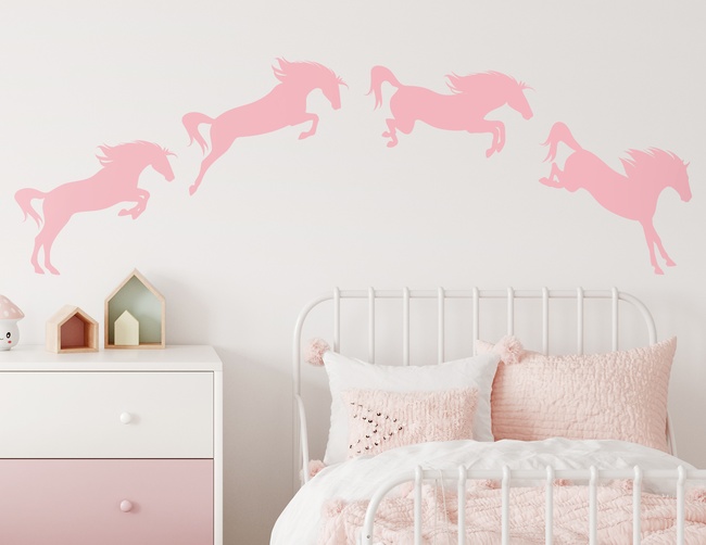 Bewegung in Zeitlupe: Vier zauberhaften Pferde-Silhouetten zum Selbstaufkleben – unser Wandtattoo Pony Joy Jumper für kleine Springreiterinnen und Ponyhof-Fans.