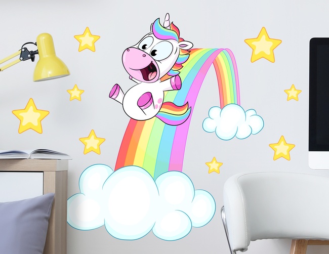 Auch unsere Enie ist mit von der Partie: Über die bunte Rutschbahn sausen, fröhlich sein und in eine fluffige Wolke fallen lassen, das macht Spaß. Wandtattoo "Regenbogen Einhorn Enie"!