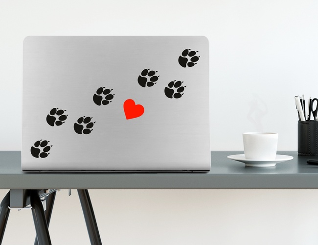 Und wer hat hier seine Spuren hinterlassen? Eine kleine Fellnase, welche uns mit ihrem liebenswerten Wesen, den treuen Augen, dem schief gelegten Kopf und dem niedlichen Pfotenabdruck einfach nur dahin schmelzen lässt – Wandtattoo "Spur zum Herz".