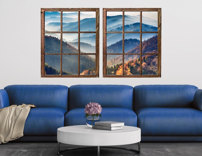 Durch die Fenster kommt schon schwaches Licht, der Nebel lichtet sich und macht endlich Platz für die ersten warmen Sonnenstrahlen, an diesem schönen Herbsttag. Hast Du Lust auf eine kleine Wanderung durch den Wald? An hohen Bäumen im bunten Blätterkleid vorbei, am Fluss entlang und auf die Berge hinauf? Wir wollen am liebsten sofort los, raus in die Natur, auf schmalen Pfaden die Gipfel erobern. Vielleicht begegnen uns Rotwild, Fuchs und Käuzchen? Wer weiß… Wir müssen nur heraustreten, die kristallklare Bergluft tief einatmen, den Blick schweifen lassen und schon beginnt ein neues spannendes Abenteuer – "3D Wandtattoo Berglandschaft"!