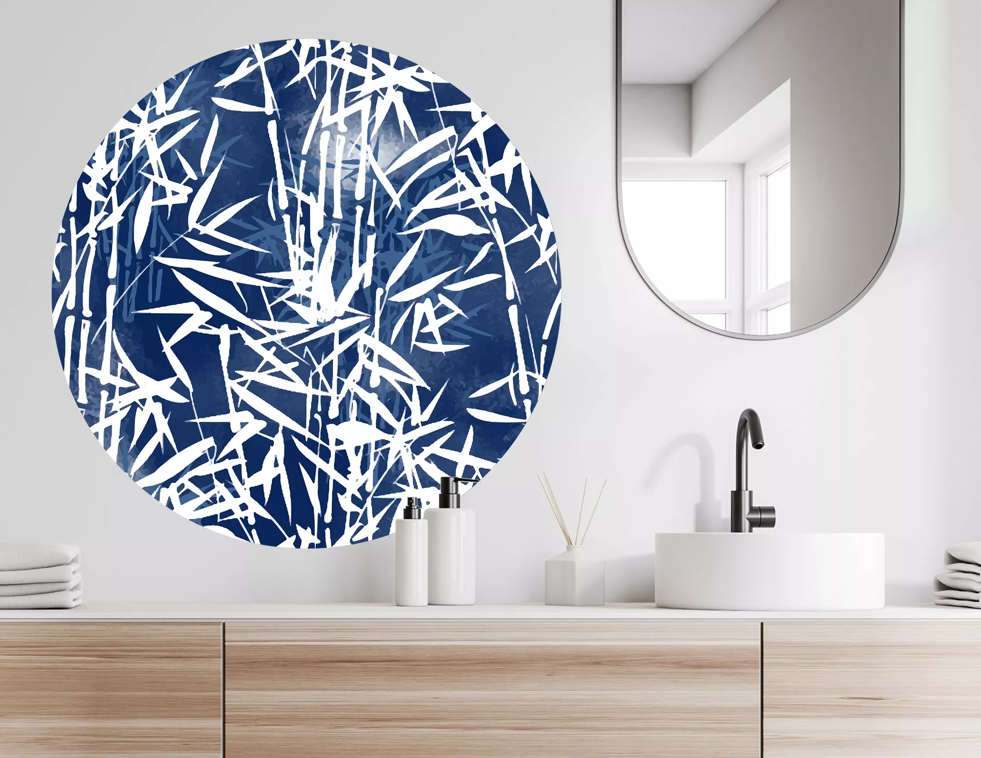 Wunderschön getuscht! Bambus ist undurchdringlich, winterhart & immergrün. Beste Eigenschaften also um dieses elegante Gewächs, mit seinen zartgliedrigen Halmen und pfeilartigen Blättern, z.B. als Hecke im Garten anzupflanzen. Unser kugelrundes Design 'Blue Bamboo', zeigt aber nicht die klassische Grünpflanze, sondern ein kreatives Artwork in schönstem Blau, welches an japanische Tuschemalereien erinnert. Ein ideales Raumaccessoire, wenn es darum geht, trophisch-exotisches Flair in die eigenen vier Wände zu holen – Wandtattoo "Blue Bamboo".