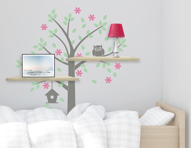 Eule Emil ist auf der Suche nach einem neuen Zuhause. Noch weiß er nicht, dass er bereits auf seiner neuen Heimat sitzt. Nur ein paar Äste tiefer hängt sein kleines Vogelhäuschen. Einmal entdeckt, kann auch Eule Emil beruhigt zu Bett gehen und tief schlummern. Mit diesem Wanddesign lässt es sich gut Geschichten erzählen. So wird aus Deinem Kinderzimmer eine kreative Spielwiese. Das Wandtattoo „Der Eulenbaum“ besteht aus einem Baum mit vielen Blüten, der Eule Emil und einem niedlichen Vogelhaus. Unser Tipp: Du kannst dieses Wanddesign auch wunderbar mit Regal oder Konsole kombinieren. So sieht es aus, als würde Emil auf dem Regal Platz nehmen. Das Wanddesign „Der Eulenbaum“ macht aber natürlich auch ohne Konsole aus Deinem Raum ein kreatives Schmuckstück.