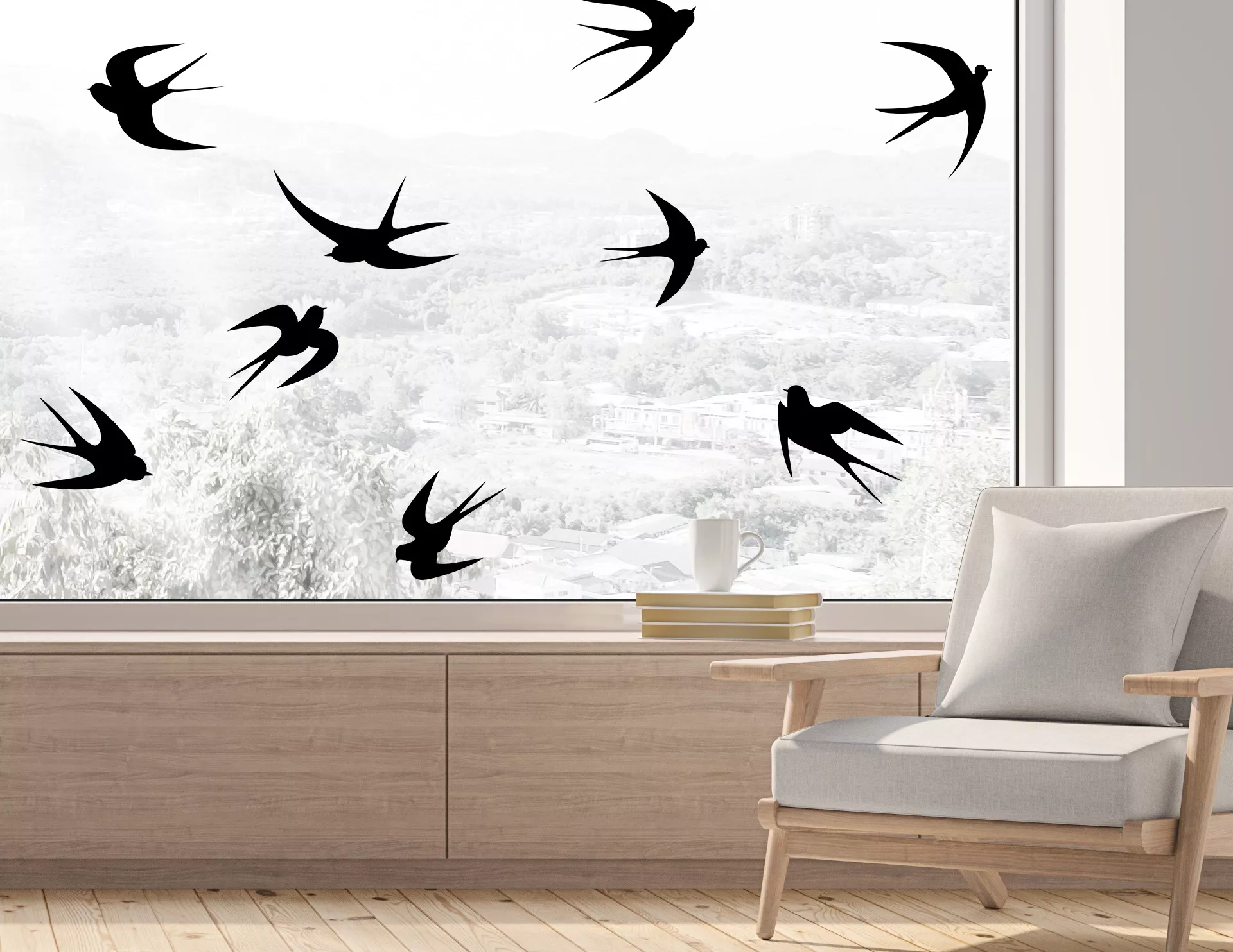 Vogelschlag an Glasflächen – ausgeschlossen! Du möchtest unsere heimische Vogelwelt schützen und Deine Fensterscheiben vogelsicher nachrüsten? Dann haben wir genau den richtigen Motiv-Aufkleber für Dich: Wandtattoo "Schwalbenschwarm", ein nützliches Design mit neun Warnvogel-Silhouetten im Flug.
