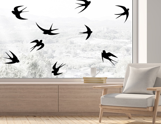 Vogelschlag an Glasflächen – ausgeschlossen! Du möchtest unsere heimische Vogelwelt schützen und Deine Fensterscheiben vogelsicher nachrüsten? Dann haben wir genau den richtigen Motiv-Aufkleber für Dich: Wandtattoo "Schwalbenschwarm", ein nützliches Design mit neun Warnvogel-Silhouetten im Flug. Eine wirksame Maßnahme gegen Vogelkollision an Glasflächen sind Markierungen, welche über die gesamte Glasfront verteilt werden. Denn gerade große Glasflächen mit freier Durchsicht, wie z.B. an Panoramafenstern oder Wintergärten, sind unsichtbare Fallen für Vögel, weil sie diese nicht als Hindernisse wahrnehmen können.