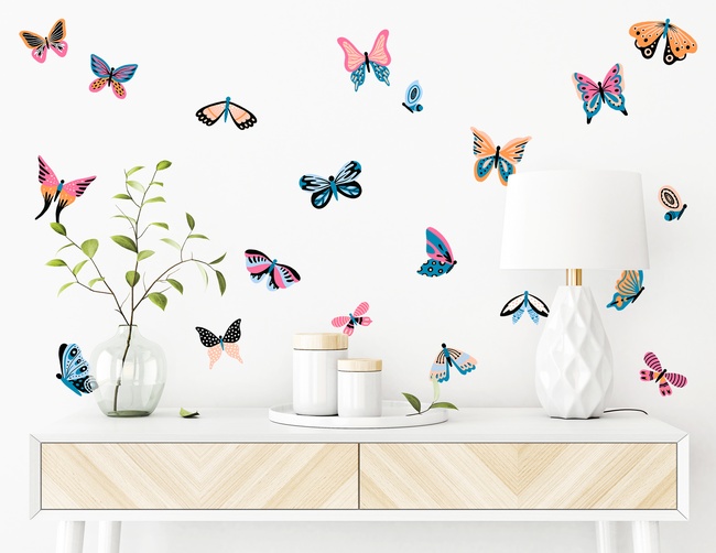 Schmetterlinge kann man ja nie genug haben, besonders, wenn sie so schön und fröhlich sind wie diese kleinen Flattertierchen vom Wandtattoo "Colorful Butterflies". Die buntgemusterten Falter erfreuen uns zu jeder Jahreszeit und sorgen für ordentlich Schwung und Leben auf der Wand. Ein zauberhaftes Design zum Aufkleben mit zwanzig bonbonfarbenen Naturschönheiten, welche viel Sommerlaune und strahlende Erleuchtung in jede dunkle Ecke bringen.