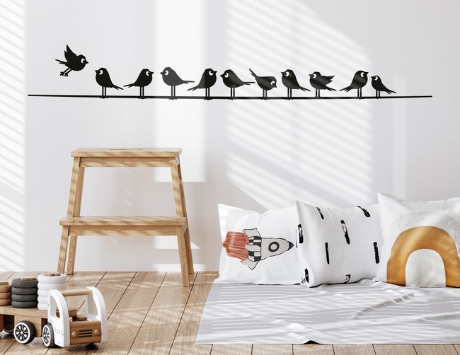 Elf charmante Vögelchen, die auf einer langen Leitung sitzen und munter ihre Geschichten austauschen, machen dieses Motiv zu etwas ganz Besonderem - unser Wandtattoo Newstime in Birdstown.