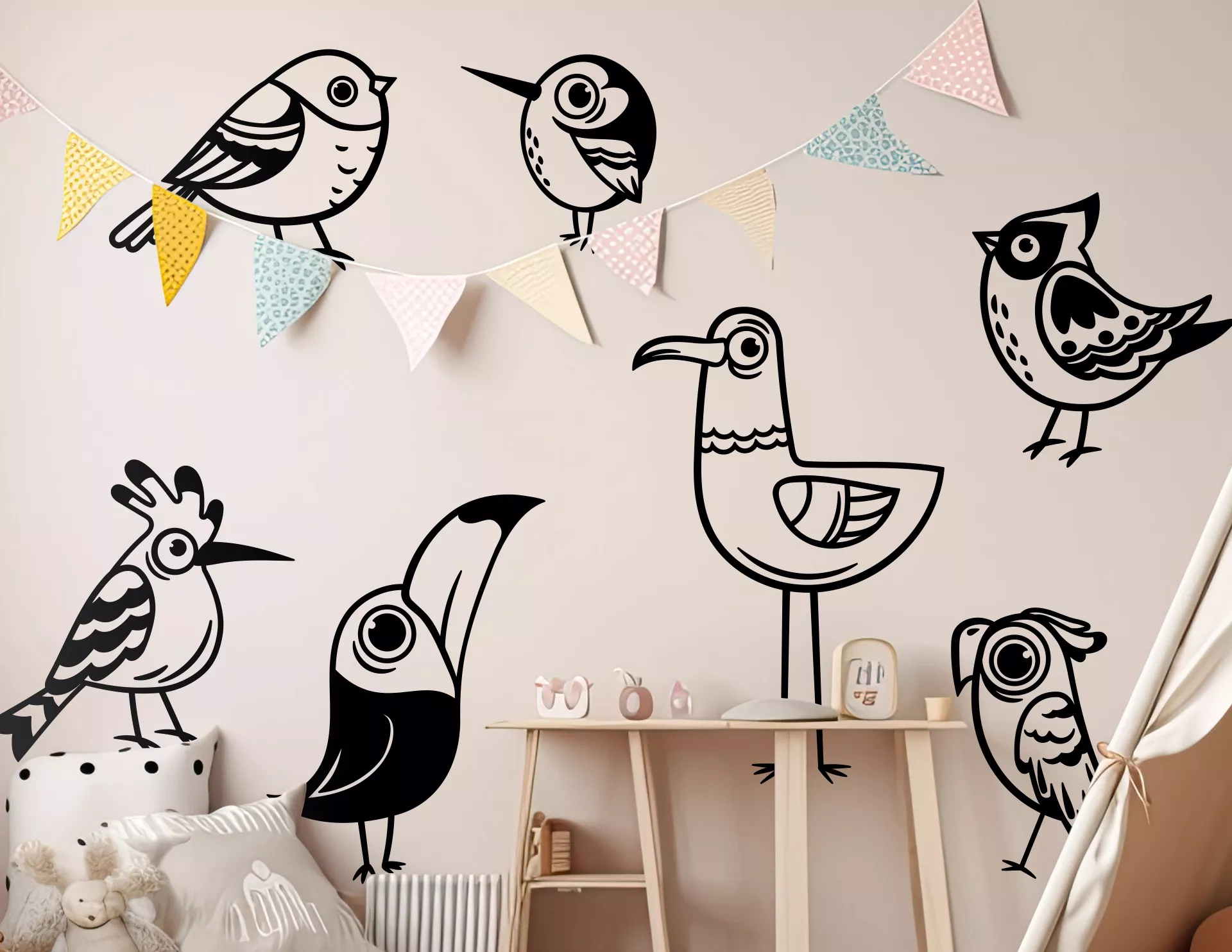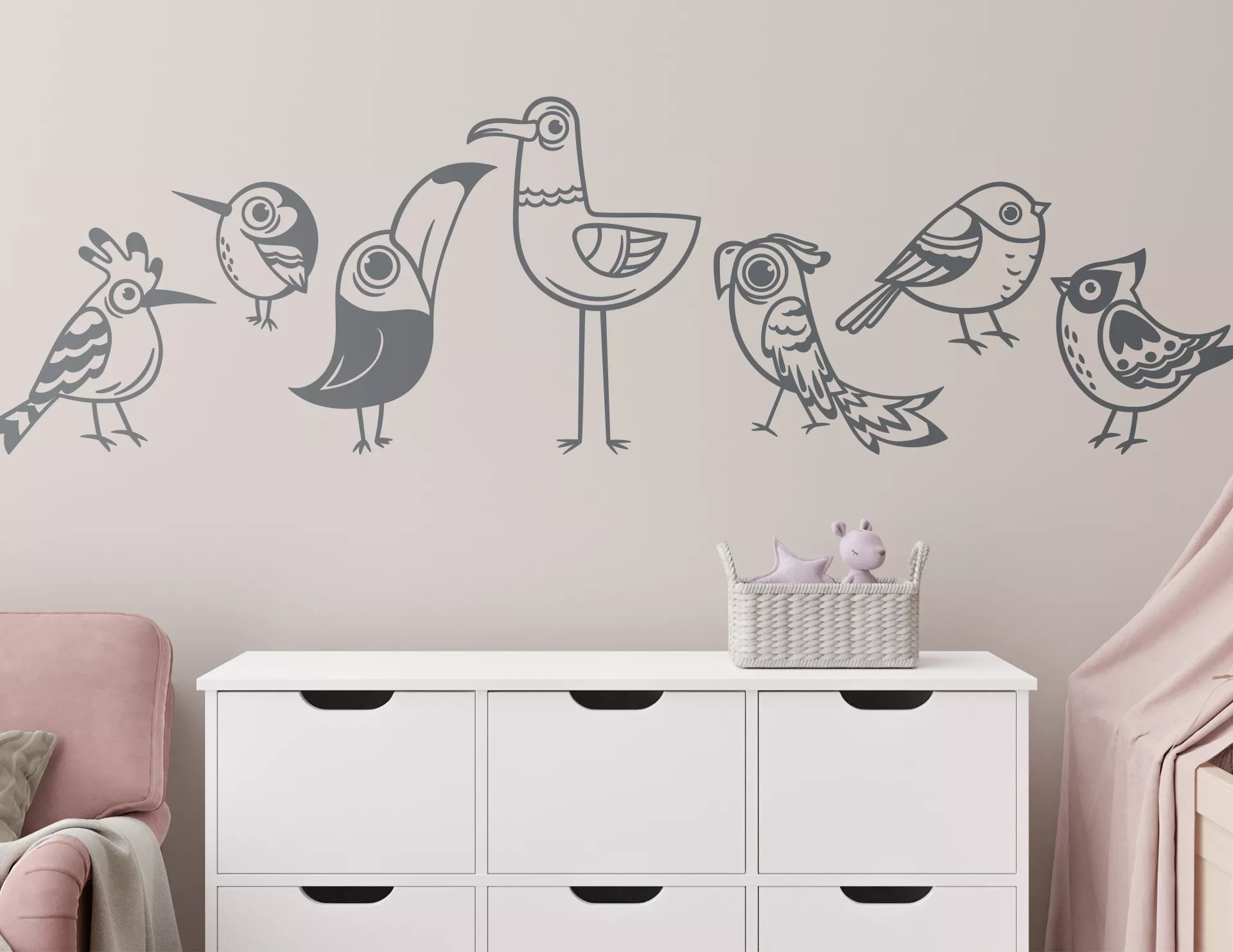 Unser Wandtattoo Sieben schräge Vögel - verwandelt jede Wand in ein lustiges Vogelparadies. Die liebevoll gezeichneten Charaktere von Eisvogel, Möwe, Wiedehopf, Gimpel, Rotkardinal, Tukan und Papagei verbreiten Stimmung und setzten gekonnt humorvolle Akzente.