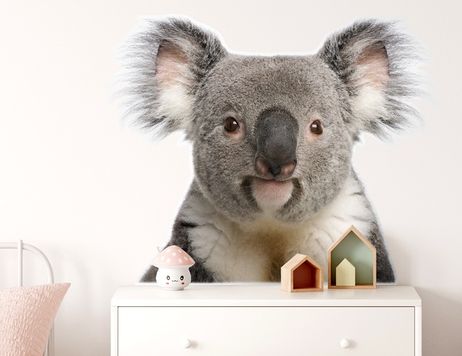 Wandtattoo "Koala Apanie": Ein Foto-Aufkleber für echte Wow-Wände mit einem liebenswerten Vegetarier aus Down Under samt braunen Knopfaugen, kleiner Rüsselnase, grau-weißem Fell und flauschigen Puschelohren ...