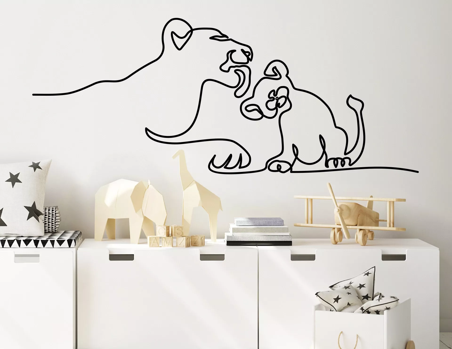 Wandtattoo One Line Art Lion & Baby: Das Raubkatzen-Design mit dem 'König der Tiere' als Mutter & Baby Szene, sorgt für liebevolles Wild-Life-Feeling an Deiner Wand.