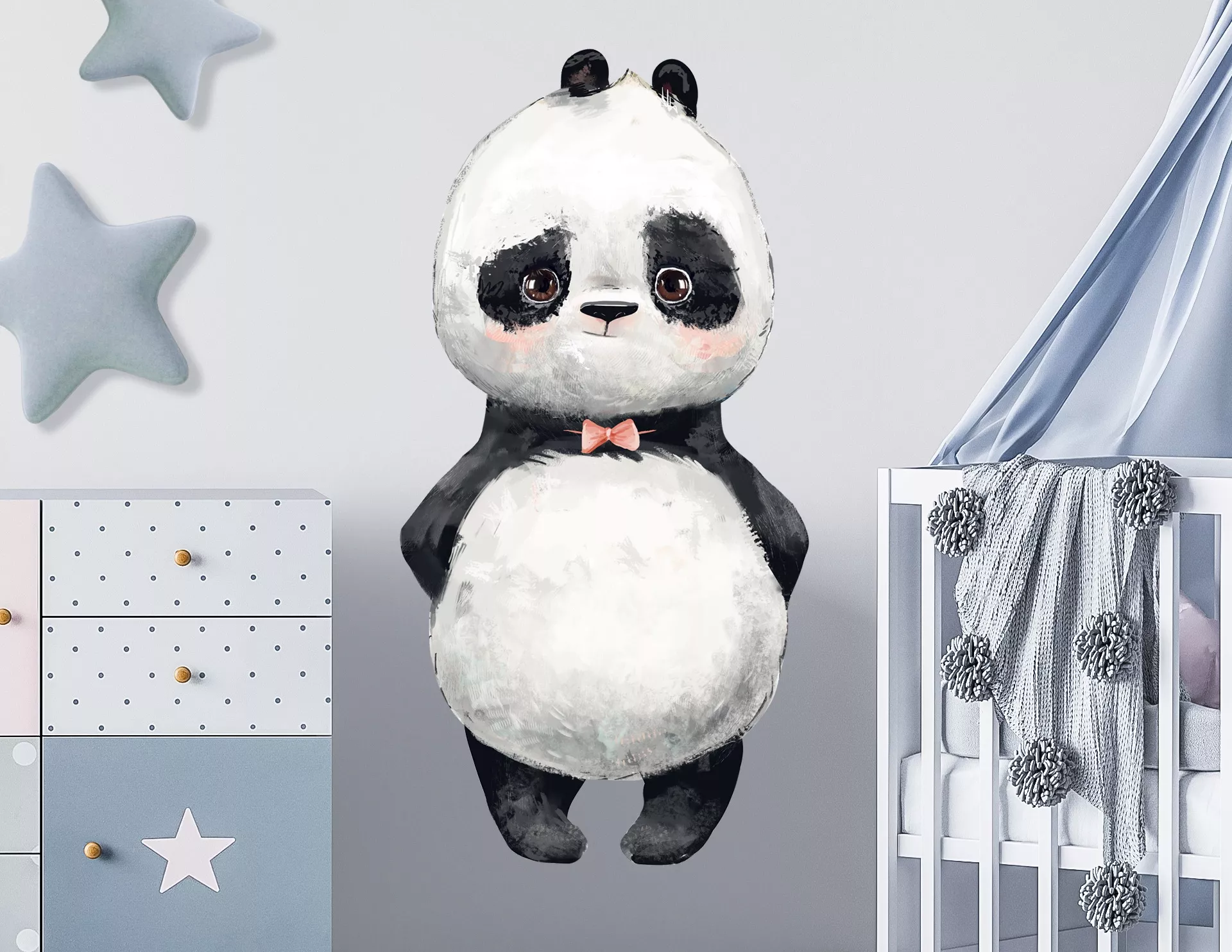 Ein Design gezeichnet in Aquarell, mit einem tapsig schwarz-weißen Bärchen samt Rosa Fliege um den Hals, welcher sich gut z.B. im Kinderzimmer, über dem Bett oder an einer Türe macht – Wandtattoo Panda Boy Jinjin.