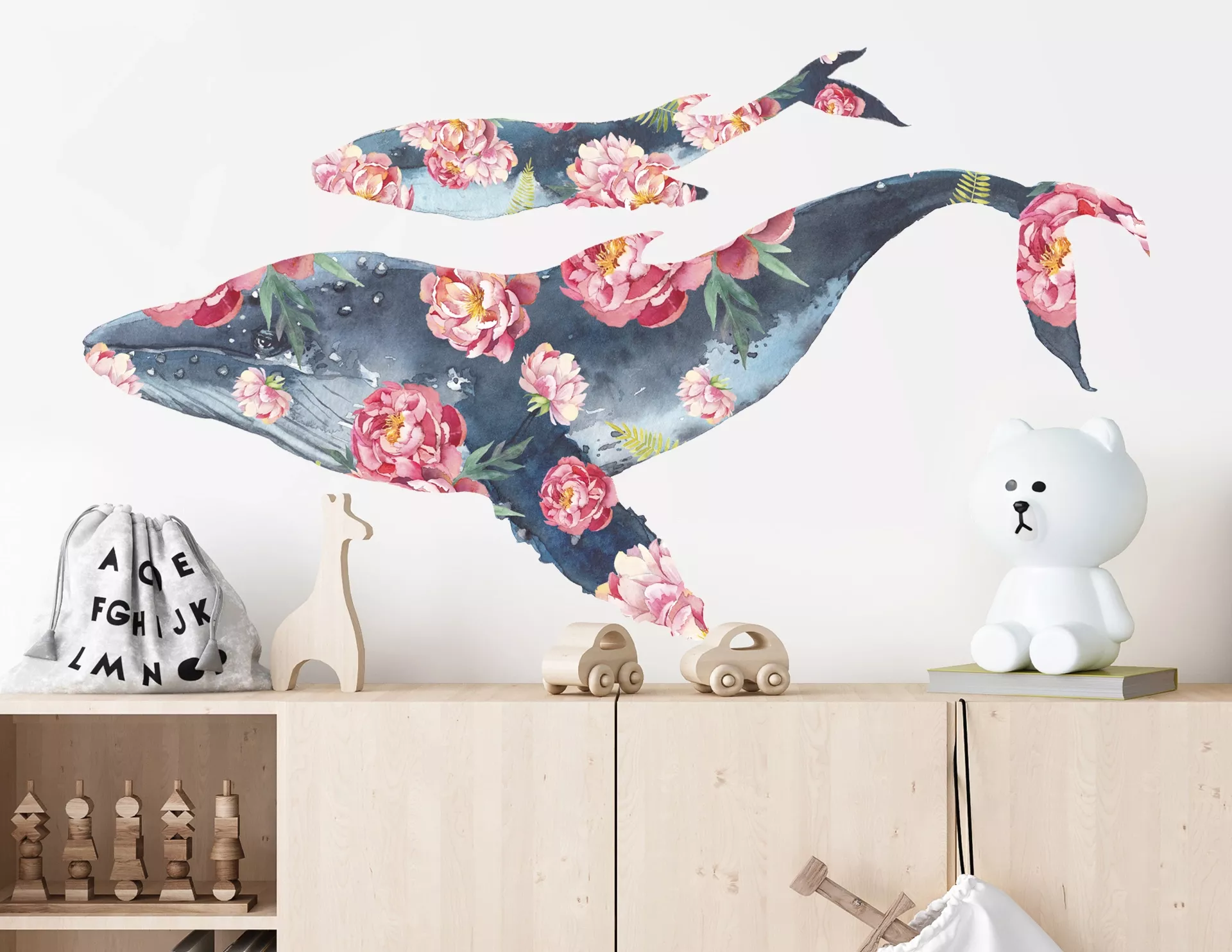 Liebe auf den ersten Blick: zwei Blauwale, welche über Wände gleiten, so schön, so farbenfroh und vor allem mit blühenden Pfingstrosen reich verziert. Unser Wandtattoo "Pfingstrosen Blauwale" – ein außergewöhnliches Design, handgezeichnet in Wasserfarben.