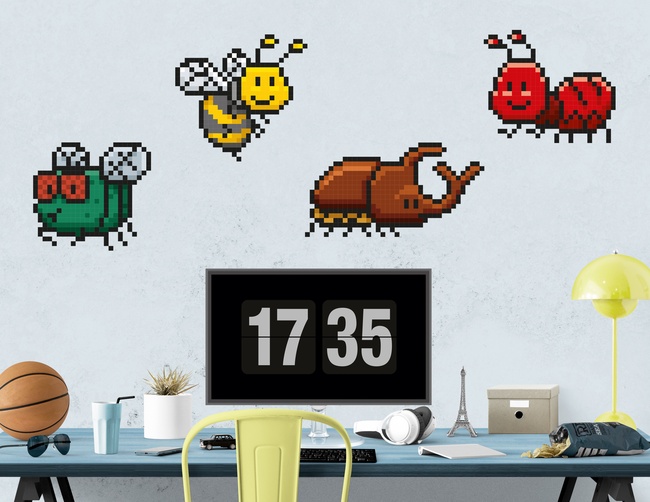 Pixel Art sind von klassischen Computerspielen inspirierte Kunstwerke. Die treppenartig abgestuften Bilder, werden aus unzähligen Quadraten konstruiert und wirken wie ein Mosaik oder ein traditionell gestickter Kreuzstich. Die so entstandenen Rastergrafiken erinnern mit ihrer technischen Ästhetik an die grafische Benutzeroberfläche von Computern der 1980er und frühen 1990er Jahre. Fliege, Biene, Ameise, Hirschkäfer, unsere vier nerdigen Insekten fühlen sich pudelwohl an jeder Wand und sorgen für echtes Chippie-Wohnfeeling. Wandtattoo "Pixel Bugs": Lässig-witzige Coolness für Dein Zuhause.
