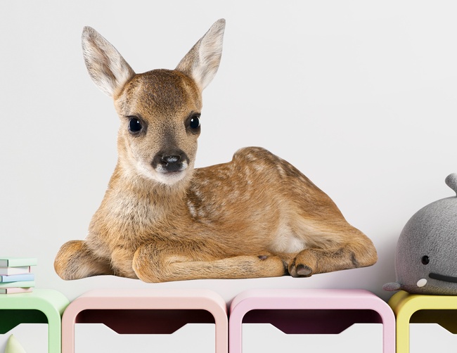 Wie alle jungen Rehe, hat auch Hettie ein hellbraunes Fell mit weißen Punkten, runde Knopfaugen, aufrecht stehende Ohren und eine kleine schwarze Stupsnase: Unser Wandtattoo Rehkitz Hettie.
