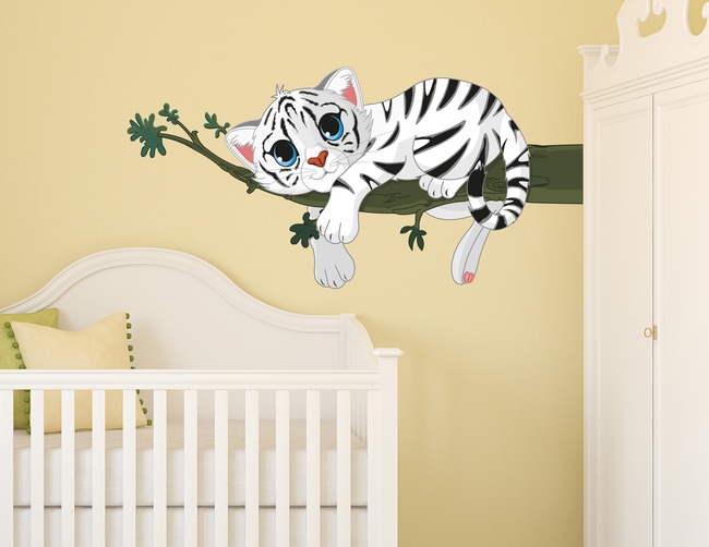 Mitten im grünen Dschungel lebt Vik, der kleine weiße Tiger. Unsere Raubkatze vom gleichnamigen Design, streift auf leisen Pfoten durch ihr Revier, ruht gerne auf einem Ast zwischen Lianen aus und brüllt auch mal kräftig los. Wandtattoo "Vik der weiße Tiger": eine tierisch-fantasievolle Dekoration für kleine und große Tierfreunde.