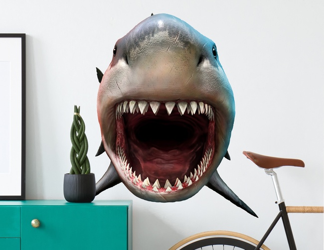 Dass er nur aufgeklebt ist, sieht man erst beim genaueren Hinsehen. Die perfekte Schock-Dekoration – unser cooles Wandtattoo Weißer Hai.