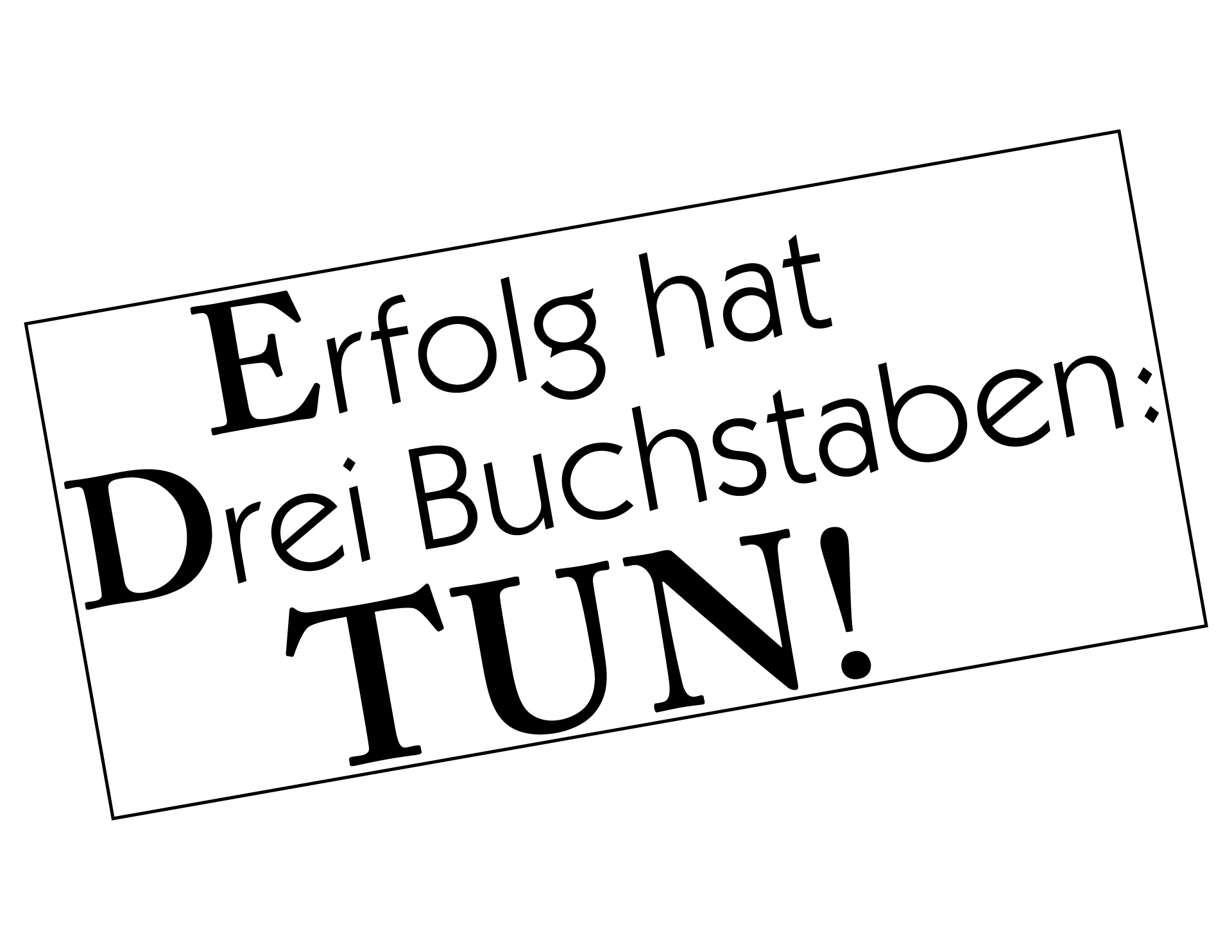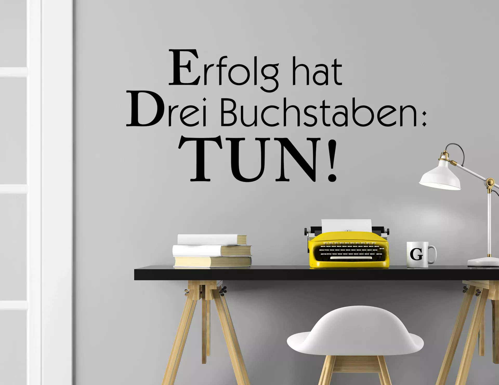 Das Wandtattoo "Die Erfolgsformel" bringt es auf den Punkt; Einfach mal MACHEN und nicht beirren lassen. Denn erst nach Fleiß und Mühen stellt sich auch der Erfolg ein – egal ob es sich um Ziele im Beruf oder im privaten Leben handelt. Dieser Motivationsspruch zeigt: Jeder kann es schaffen und seine eigene Erfolgsgeschichte schreiben! Spruch: Erfolg hat Drei Buchstaben: TUN!