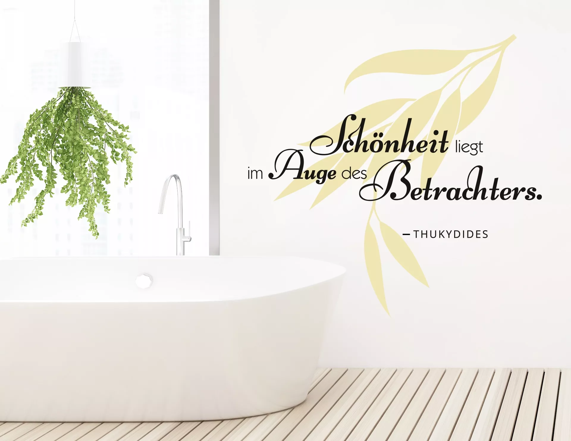 Das Wandtattoo „Erlesene Schönheit“ ist ein zeitloses sowie schlichtes Wandzitat und trumpft mit seiner Zweifarbigkeit. Die einzelnen Worte sind in handschriftlicher und geradliniger Schriftart gemixt, sodass das Wandbild viel Abwechslung verspricht. Die dekorativ platzierten Blätter runden das Gesamtbild perfekt ab und bringen Spannung in Deine vier Wände. „Schönheit liegt im Auge des Betrachters.“ Dies wusste auch schon Thukydides, der ein antiker griechischer Historiker war und uns diese weisen Textzeilen hinterließ. Verziere Deine Räume mit diesem exklusiven Wandaufkleber und mache ihn so zum absoluten Blickfang in Deinem Heim.